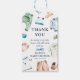 Chá de fraldas Bonito De Bebê Obrigado Por Tags Favoráveis. Apresentando um clássico fundo branco, uma fronteira de roupas de bebê doce, brinquedos de madeira e acessórios. Personalize a mensagem do seu próprio obrigado para torná-la pessoal para você.