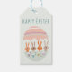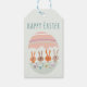 Cadeau Label met gezellige illustratie van 4 paashaasjes aan tafel. Op de tafel eierdopjes met daarin een eitje. Tektst "happy easter". De tekst kan aangepast worden.