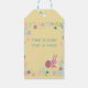 Cadeaulabel geelkleurig met paashaasje en ei omringd door bloemen. Tekst voorkant: Vrolijk Pasen Tekst achterkant: Veel plezier met je kado. Beide teksten kun je aanpassen