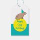 Estas etiquetas de presente personalizadas de capivara apresentam minha própria arte original de uma capivara alegre usando um chapéu festivo colorido de aniversário. Projetadas para tornar os presentes ainda mais especiais, são perfeitas para embrulhar presentes de aniversário para crianças, amantes de animais e qualquer pessoa que adore essa criatura famosamente adorável.