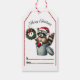Uma bela etiqueta de Natal mostra um guaxinim divertido num chapéu de Papai Noel, segurando uma coroa em meio a decorações de férias. Perfeito por adicionar alegria aos seus presentes festivos nesta temporada.