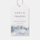Coloque essas doces etiquetas de presentes nos favores do seu casamento para uma maneira perfeita de expressar seu amor e obrigados. Projetados para coordenar com nossa coleção de convites para casamento em Snowbound, estas etiquetas chic envenenadas apresentam um fundo aquoso de uma cena de montanha de neve pontilhada com pinheiros azuis e cinzas, com "amor e obrigados", os seus nomes e a data de casamento em cinza-azul. Todos os campos de texto são editáveis para a máxima personalização!