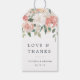 Coloque estas elegantes etiquetas florais nos seus favores de casamento para dizer obrigado aos hóspedes no estilo chic. As etiquetas brancas apresentam um buquê de peônias e rosas em cor-de-rosa-pincel, pêssego e marfim, com folhagem verde-salva. "Amor e obrigados" aparece abaixo com seus nomes e data de casamento. Todo texto é editável para a personalização máxima.