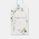 Etiquetas de presente de casamento com eucalipto florestal trendy em aquarela com moldura geométrica dourada e tipografia elegante.