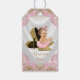 Garotas chá de fraldas de etiquetas de presente com uma menina de cabelo escuro e fofinha vestindo um tutu rosa e pérolas sentadas em um par de calçados de alto salto de ouro rico em um fundo de espiral rosa e dourado. Essas bonitas etiquetas de presentes de chá de fraldas são facilmente personalizadas com seu texto. Estas são design impressas sem brilho real, pérolas, cetim, etc.
