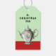 Etiquetas de presentes para festas de chá de férias ou favoritos para festas com bule de prata de Papai noel e uma linha de Natal criativa.