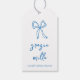Este lindo design de chá de noiva inspirado na Itália apresenta letras cursivas manuscritas azuis acentuadas com uma ilustração de laço de fita desenhada à mão. Estas etiquetas de lembrança de chá de noiva mediterrâneas elegantes apresentam "grazie mille" em letra manuscrita com o nome do seu evento abaixo.