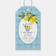 Um design elegante de Chá de Panela com fundo de azulejo azul e um copo de limões.