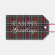 This elegant and contemporary gift bag label features a plaid pattern with the classic "Season's Greetings" message. It showcases shades of green, dark blue, and red, evoking a classy and nostalgic English holiday ambiance. You can personalize it with your own family name or text. This label is ideal for decorating Christmas gifts in a classic colonial style, as well as for a charming country cottage or log cabin theme.