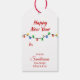 Na frente desta etiqueta de presente de Natal está uma imagem de um adorável cão Cocker Spaniel num saco de presente de Natal vermelho e branco. Atrás do cachorro há uma série de luzes coloridas de Feriado. O texto no topo diz "Feliz Natal". A parte traseira da etiqueta repete a imagem das luzes Feriados, com campos de texto em vermelho para que você personalize.
