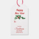 Na frente desta etiqueta de presente de Férias está uma imagem de um adorável coelho marrom a espreitar de uma estocagem vermelha ornamentado. A imagem é cercada por groselhas ocas, vermelhas e poinsettia floresce. O texto no topo diz "Feliz Natal". A parte de trás da etiqueta tem outra imagem de uma imagem de preto-e-branco, com campos de texto em vermelho para que você personalize.