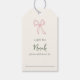 Este lindo design de chá de panela inspirado na Itália apresenta letras cursivas em estilo manuscrito verde acentuadas com um laço de fita rosa desenhado à mão. Personalize essas elegantes etiquetas de chá de exibição mediterrâneas com o nome da convidada de honra. Espaço fornecido para os convidados preencherem seus nomes. Inclua uma etiqueta em cada convite com seu pedido de presente "exibir chá" desembrulhado.