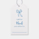 Este lindo design de chá de panela inspirado na Itália apresenta letras cursivas em estilo manuscrito acentuadas com um laço de fita azul desenhado à mão. Personalize essas elegantes etiquetas de chá de painel de exibição mediterrâneo com o nome da convidada de honra. Espaço fornecido para os convidados preencherem seus nomes. Inclua uma etiqueta em cada convite com o seu pedido de presente "exibir no chá" desembrulhado.
