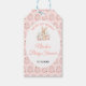 A charming Easter‑themed baby shower gift tag featuring a sweet bunny surrounded by soft pink floral eggs. The patterned background adds a festive spring feel, while the central layout keeps the event details clear and elegant. Perfect for celebrating a mom‑to‑be with an Easter twist, springtime palette, and gentle woodland charm.