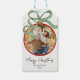 Add a festive and personal touch to your presents with this elegant green ribbon Christmas gift tag, featuring a beautiful ornament frame for your favorite photo. Designed with subtle gold confetti and stylish calligraphy, “Merry Christmas,” this tag brings warmth and charm to every gift. Easily customize the name, year, and photo to make it uniquely yours. Perfect for families, friends, or anyone who loves timeless holiday details that celebrate the joy of Jesus this Christmas season.