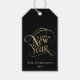 Modern black gift tags featuring "Happy New Year" in an elegant gold calligraphy script. Personalize with your name and the year.