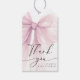 This elegant tag features a large, ethereal pink ribbon bow with delicate watercolor textures that sweep across the design. The "Thank You" message is displayed in a beautiful, flowing script that overlaps the watercolor ribbon, paired with a sophisticated serif font for a high-end, designer look.
