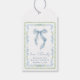 Etiquetas de agradecimento de presente de chá de noiva chiques e caprichosas com uma moldura de aquarela floral azul e verde com detalhes em verde escuro vintage, um elegante arco azul e "amor + agradecimento" exibidos em uma caligrafia azul.