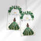 Adicione um toque de elegância à sua celebração com esses rótulos de agradecimento para quinceañera em verde esmeralda com falso folheado a ouro. A frente apresenta uma coroa real, borboletas e o nome da aniversariante, enquanto a parte de trás destaca uma mensagem especial de agradecimento. Perfeito para anexar às lembranças da festa ou presentes, esses rótulos unem o tema da quinceañera de forma elegante e memorável.