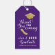Crie etiquetas personalizadas de presente de formatura da turma de 2025 em roxo, branco e dourado com a frase Obrigado por comparecer e ilustrações de diploma e do chapéu de graduado. O modelo de design facilita a digitação do nome do graduado e do ano.