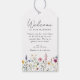 As legantes etiquetas de presentes florais de boas-vindas com uma borda inferior de flores silvestres e folhagem de cor d'água em tons de rosa, amarelo, roxo, azul e verde em um fundo branco. Personalize as etiquetas de flor silvestre com uma pequena mensagem de boas-vindas, seus nomes ou texto personalizado. As etiquetas de presentes de flores silvestres são perfeitas para as bolsas de boas-vindas de hotel para o seu casamento de primavera ou verão.