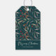 Adicione um toque elegante aos seus presentes de férias com estas lindas etiquetas de presentes. A design moderna apresenta um padrão de botânicos de inverno, pinecones e bagas na frente e atrás com Feliz Natal em uma tipografia esbranquiçada. Personalize com seu nome.