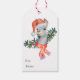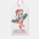 Uma imagem de aquarela de uma adorável lama branca é a característica em ambos os lados desta etiqueta de presente de Natal. O lama veste um chapéu de Papai Noel vermelho e branco e um cachecol. Atrás dele está um sorvete de sagrado com bagas vermelhas. Na frente, o texto na parte inferior diz "Llama Mia! MERRY CHRISTMAS". A parte traseira da etiqueta tem a mesma imagem, com um campo de texto "Para" e "De".