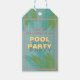Etiqueta de presente do partido piscina com água ilustrada para piscinas de natação e frondes de palma num estilo moderno do século médio. Designs incluem elementos de blues, pinks, frondes de licença de palma, piscina de natação e design. Inclui modelo para personalização pessoal.