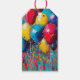 Para e de balões coloridos vermelhos, azuis e amarelos... as etiquetas de presentes de aniversário felizes.