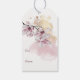 Dois beija-flores cor-de-rosa e cinza se juntam num galho na frente desta etiqueta de presente de aniversário. Atrás deles está uma pintura de ouro e rosa, com embelezamento de ouro rosa. O texto do roteiro no final diz "Parabéns". A parte de trás da etiqueta tem uma bonito imagem de flores cor-de-rosa. Certifique-se de ver o cartão de aniversário correspondente e outros itens na nossa loja.