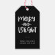 Feliz Festiva E Brilhante, etiquetas de presentes de férias. Design apresenta uma citação tipográfica branca de feriado em preto. linha de texto modelo para a sua mensagem.
