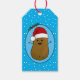 Adorável e engraçado batata marrom feliz vestindo um chapéu de Papai Noel vermelho e branco. A batata está em um estilo de arte cartoon e castanho colorido, tem braços e dedos colados e um sorriso grande e feliz com pontos para os olhos. O chapéu de Papai Noel em sua cabeça é vermelho, com um verme branco e uma pompom branca pendurados. Ele tem dentro a forma oval azul claro com uma estrutura azul escura e duas folhas ocas verdes com duas bagas vermelhas no topo do oval. A cor de fundo é um azul claro, com flocos de neve brancos flutuando prestes a dar uma sensação festiva a esta bela etiqueta sazonal. Na parte traseira da etiqueta estão modelos de texto para deixar como estão ou substituir o texto por sua própria mensagem. Também modelos para adicionar seu nome a personalizar.