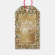 Feliz Natal em letras brancas elegantes em um toque de folha de ouro falso, essas etiquetas de presente apresentam um fundo de rabiscos dourados modernos sobre uma estampa de leopardo selvagem. Personalizado com seu nome. Pratos de papel, guardanapos e MAIS designs correspondentes em nossa loja.