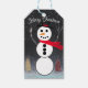 Um boneco de neve numa cena de inverno nevado vestido com um cachecol vermelho, um chapéu com nariz vermelho de cenoura com as palavras Feliz Natal mostrado acima.