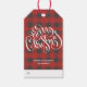 Faça suas próprias etiquetas de presente de Natal / etiquetas de favor de festa com estas etiquetas personalizadas com Feliz Natal em uma escrita elegante e sua mensagem abaixo em um padrão xadrez escocês vermelho e cinza carvão.