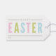 Etiquetas de presente de Páscoa feliz. Uma adição moderna às cestas e presentes de Páscoa. Esta etiqueta de presente de Páscoa apresenta uma paleta de primavera de rosa claro, verde lima e azul céu com um fundo de padrão de listra pintada coordenada e cordão cinza.