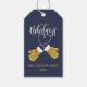 Feliz feriado em fontes mistas. Feliz em letras maiúsculas amarelas ouros escuras e Feriados em letra branca. Um par de luvas douradas com algemas brancas e uma corda cor-de-rosa formando um coração. Colocado em azul escuro sólido. Personalize com seu nome ou mensagem na fonte de estilo de escrita manual do ouro.