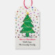 Personalize as etiquetas de presentes de Natal com o nome da sua família para dar um toque especial aos presentes para a família e amigos.A festiva árvore de Natal com luzes e estrelas no topo adiciona alegria e festividade às etiquetas de Natal com Feliz Desejo de Natal.O padrão de pontos de confete reluzente à volta da árvore de Natal e na parte de trás adiciona um olhar alegre e na moda. Ilustração original por sema.