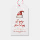 Chapéu de cor de água festiva Santa, etiquetas de presentes de férias. Características, tipografia vermelha com suporte de padrão de faixa de coordenação.