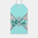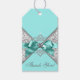 Etiqueta de presente azul turquesa e prata com laço azul turquesa em um belo fundo damasco azul turquesa e cinza prateado. Adicione seu texto na frente e atrás no estilo de fonte de sua escolha.