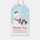 Winter Wartiderland "ONEderland", primeira festa de aniversário a favor tag design, apresenta uma letra no estilo canavial doce e obrigado personalizado que você escreve com um fundo com padrão de floco de neve azul de gelo. Cor azul turquesa, vermelha e branca.