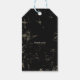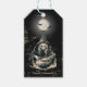 Tags do Fato de Figurino de Halloween Hunted Gótico. Esta etiqueta de presente apresenta uma design escura e gótica com um fundo preto sujo. Os sotaques do ouro rústico do ornamentado enquadram a placa, enquanto o título do evento, "Halloween Assaltado", é exibido em um roteiro gótico de ouro estranho. A sutil imagem de uma bruxa assustadora misturando sua poção mágica e uma lua de cheio melhora a atmosfera estranha. Fácil de editar com o seu próprio texto à frente e atrás.