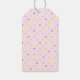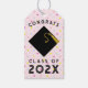 Etiqueta de presente de formatura rosa, design de lembrancinha de festa com boné preto e borla dourada em fundo de bolinhas. Edite o texto para personalizar.