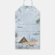 Fox e cabine aquarela inverno maravilha paisagem nevada ao ar livre cena personalizada etiquetas de presentes de Natal. Estas etiquetas de presentes de Natal apresentam uma cor aquosa, neve de inverno e floco de neve ao ar livre, com raposa, cabana, árvores, galhos de árvores e bagas cada vez verdes. Fundo azul gelado. Belo e elegante design mágico de Xmas paisagístico natural.