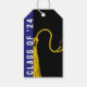 Graduação criativa parabéns etiquetas de presentes, com boné preto com fita de ouro em fundo azul para segundos graus e formandos universitários. Editar texto para adicionar ano. Adicione o nome do formando para personalizar ainda mais.