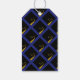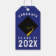 Etiquetas de presente criativas de congratulações de graduação, apresentando um boné preto com borla dourada em um fundo azul. Edite o texto para adicionar o ano.