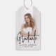 Adicione uma etiqueta personalizada à sua festa de formatura a favor de bolsas e caixas com estas etiquetas de presentes de graduação de fotos! A etiqueta de favor de graduação apresenta a foto vertical de sangria de cheio do formando com "Formando" exibido em uma camada de script preto manuscrito. Personalize a etiqueta de favor da graduação de fotos com o nome do formando e o ano de graduação. A tag reverte para exibir um fundo preto sólido com espaço para fotos e texto adicionais. Esta etiqueta de favor da graduação moderna é perfeita para segundos graus e formandos!