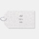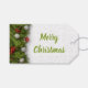 A etiqueta de presente de Natal apresenta galhos e ornamentos de pinheiros verdes com Feliz Natal em cor verde correspondente. Cinzas leves e padrão branco de flocos de neve no fundo em ambos os lados. Texto personalizável na fonte bonito de escrita manual preta no verso.