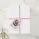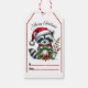 Uma charmosa etiqueta de Natal com óculos vestidos de guaxinim e um chapéu de Papai Noel, segurando uma coroa enfeitada com bagas. Perfeito por adicionar um toque caprichoso a presentes de férias.