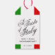 Celebre a sua festa de noivado e futuro matrimônio com um evento de degustação de comida ao estilo italiano. Permita que todos socializem enquanto degustam os pratos mais populares e deliciosos da culinária italiana. Estas etiquetas de presente apresentam listras da bandeira italiana emoldurando a lateral junto com as palavras "um gosto da Itália" em direção ao centro. Todos os elementos do item estão desbloqueados e personalizáveis, incluindo a frase "Um gosto da Itália".
